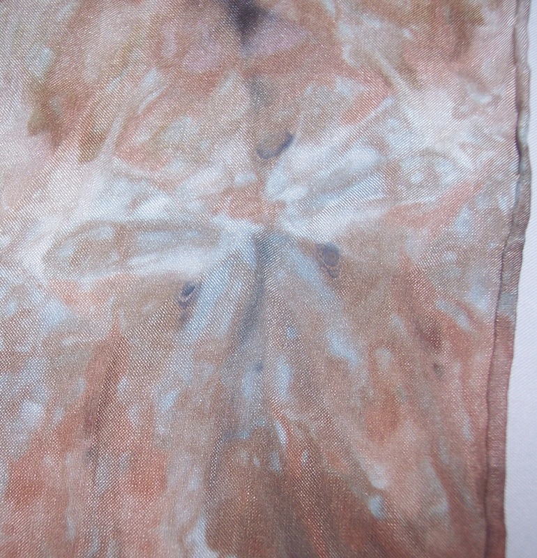 Moving forward to last week..........More ice dyeing with friends. This time I took apart two silk jackets and a skirt. I  Have not worn one jacket in a very long time,  and the suit was never worn. I thought they would more useful made into other things. Project bags maybe. I also dyed some silk scarves. Two of the scarves were from last fall. I was not totally happy with them so I over dyed them. This shows before and after.